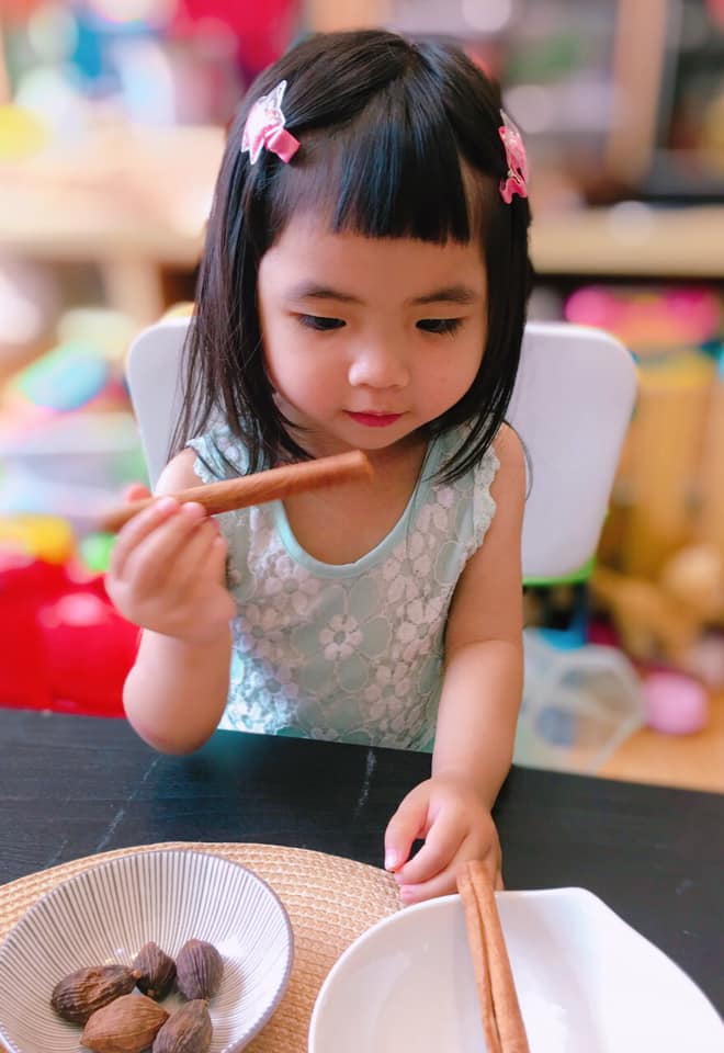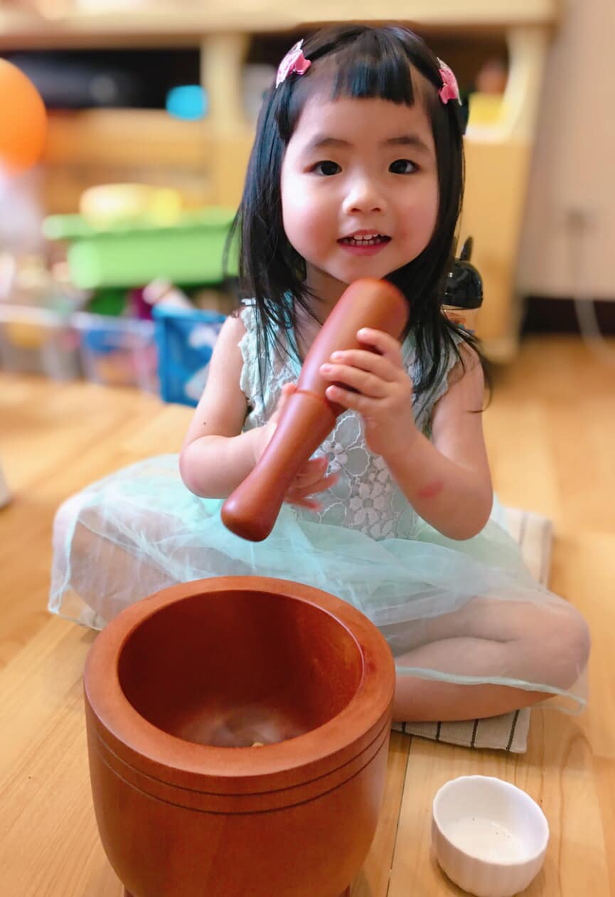 延續上周的體驗模式,今天開場讓擺了滿桌的藥材先帶來視覺刺激,隨後加入觸摸、嗅覺及認識藥材的名稱。不同的是這次加入了搗碎藥材活動。 搗碎做為一種合理的敲打,也是孩子們喜愛的項目之一。在每一次的敲打中,小Ros 逐漸調整自己的手部握姿,直到找出了最合適的使力方式。
