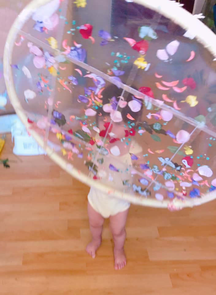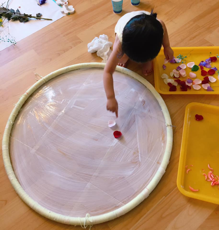 接著進入「 圓 」的作品,將透明片與呼拉圈結合,倒入白膠水並塗抹均勻就可以黏貼花瓣了!一開始小Ros 一片一片黏,後來我提議可以”撒”她顯得更加開心,直到最後小Ros 還延伸出用紙杯裝花瓣再大量撒落的方式。