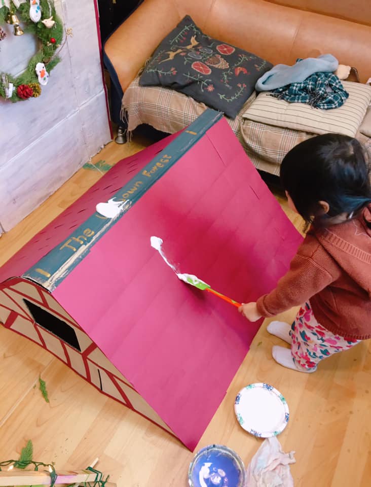 也許是小屋的靜謐安全感,剛完成一邊門牆時,小Ros 等不及開始玩起敲門、關門、待在裡面的遊戲。她搬了椅子,帶著狗狗玩偶,說要在裡面陪狗狗睡覺。
