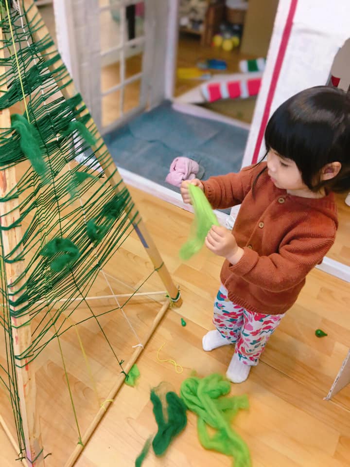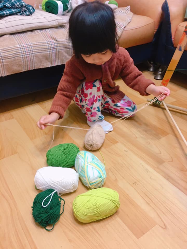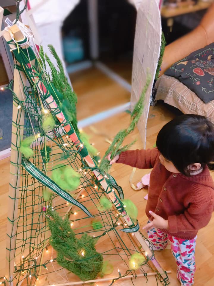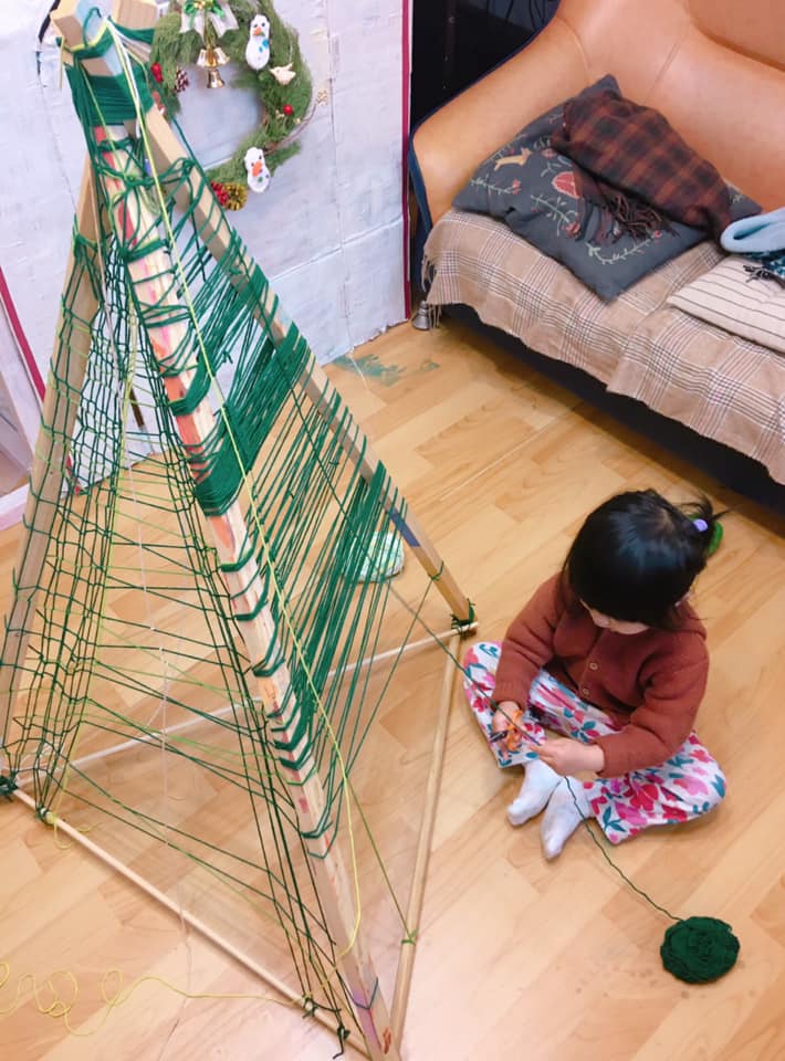 ,並在自製的骨架上編織了毛線格,讓小Ros 參與一點繞毛線的部分(主要只是接觸毛線球,體驗線繩環繞的變化,順便看看不同色階的綠)。接著我拿出扁柏、羊毛氈、緞帶及上週做的聖誕球進行佈置,大部分的物件小Ros 可以自己插進毛線格,球的部分則協助她綁在她想要的位置。