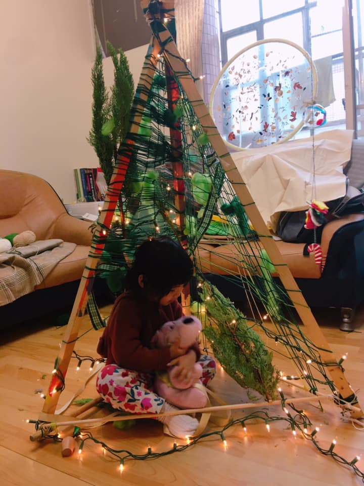 小屋外的空地放了用木棍架出來的聖誕樹